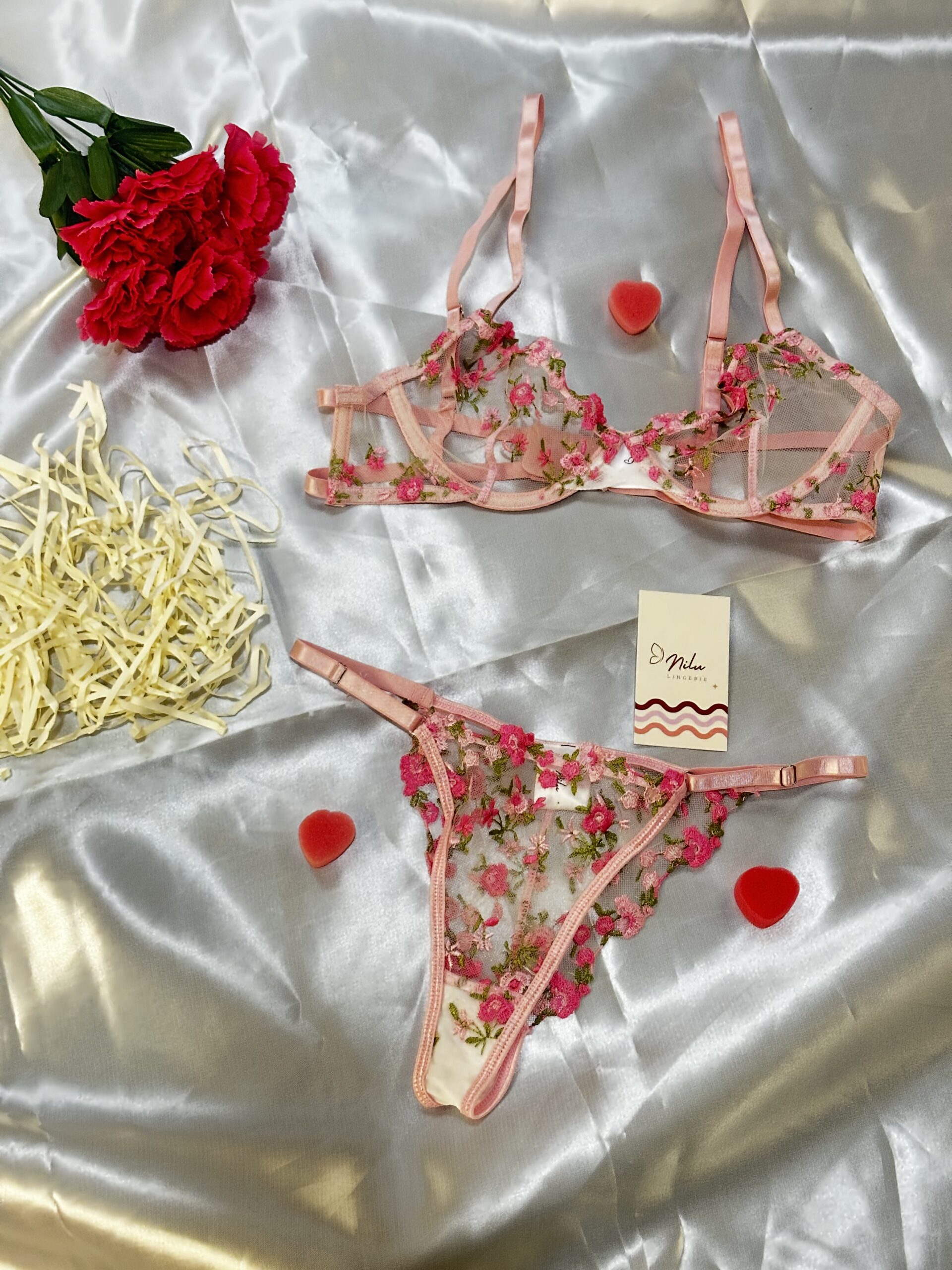 Conjunto de Lencería Transparente con Bordado Floral Rosa – Sensualidad y Elegancia
