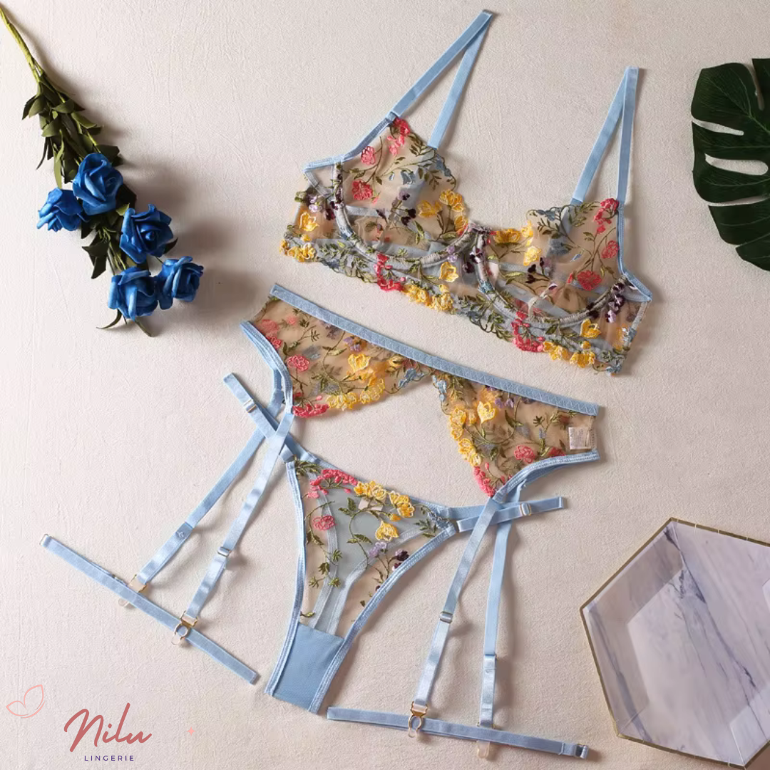 🌸 Conjunto de Lencería Bordado Azul con Liguero – Sexy y Elegante